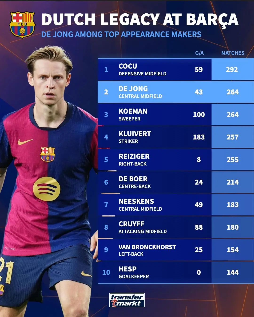 德容为巴萨出场数达到264,追平科曼升至队史荷兰籍球员第二位,仅次于292场的科库。