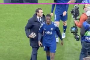 登贝莱当选次回合的全场最佳球员,不过他起初拒绝领取MVP奖杯,领奖之后的合影环节也是一脸严肃。